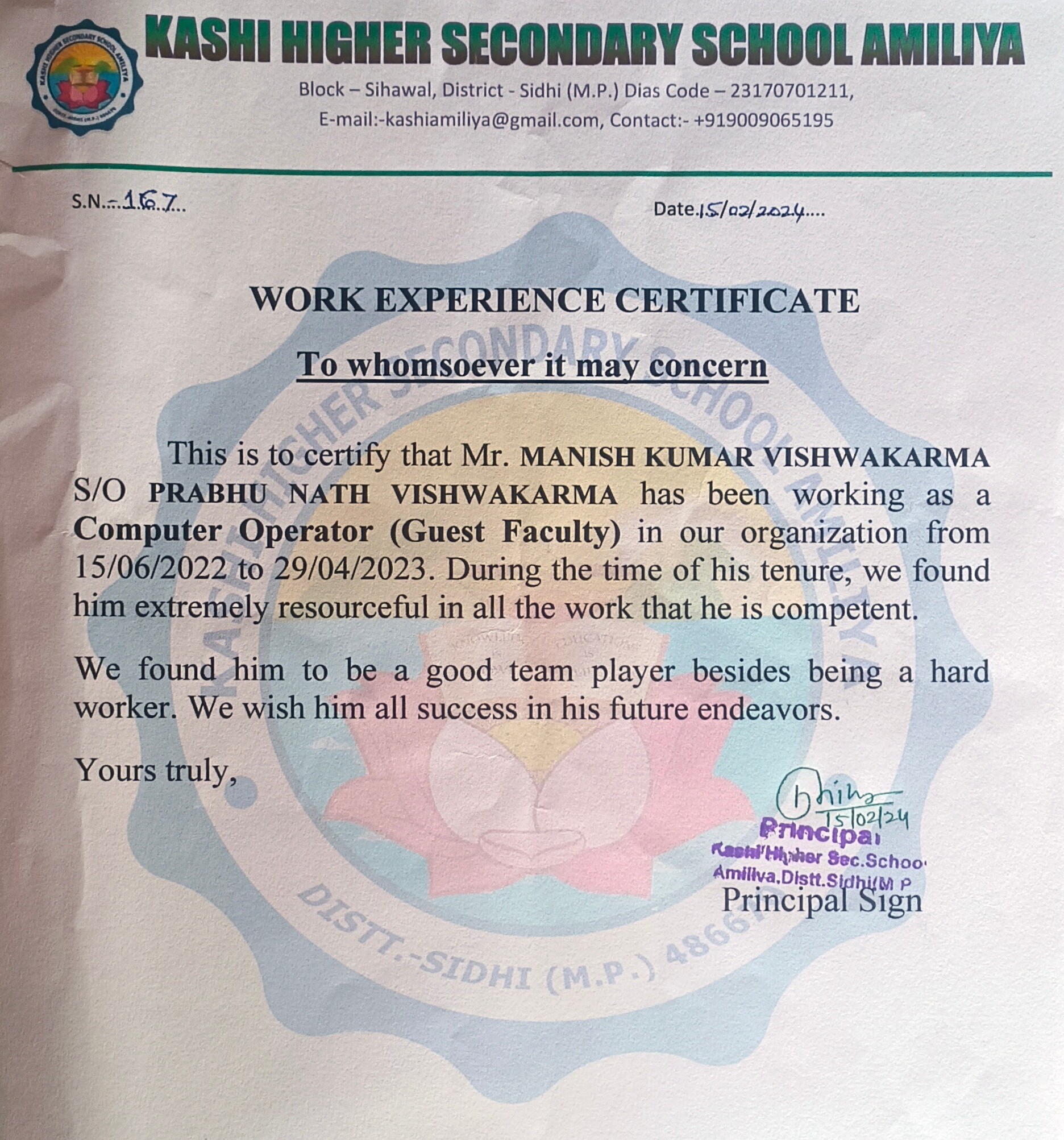 I have one year experience working with Kashi Higher Secondary School Amiliya, District-Sidhi (M.P.) as a Data Entry Operator/Computer Operator. I have good knowledge in MS-OFFICE. I have knowledge of work data entry in MS-Office. Create note of tasks, files and progress. Compare data to source documents to ensure accuracy. Correct, verify and delete non-required data. Transfer data from paper formats to computer files or database system utilizing keyboard data recorders or optional scanners.