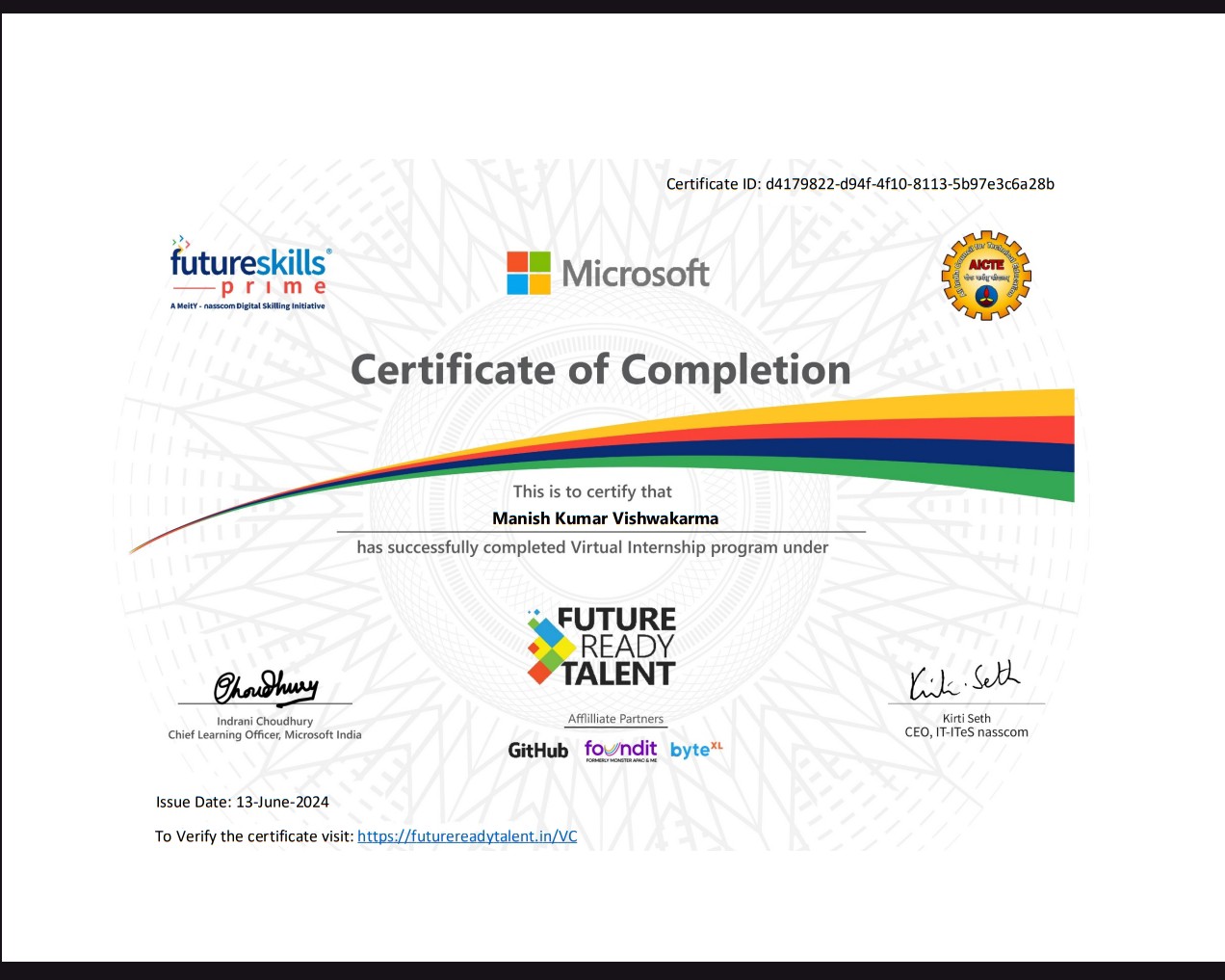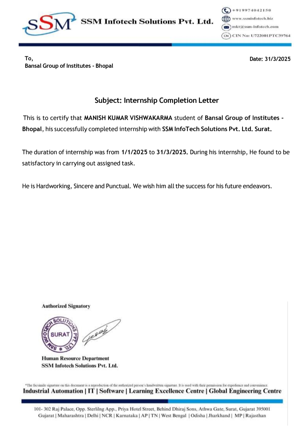 Previously, I interned at SSM Infotech, Surat, completed the Microsoft Future Ready Talent Program, and participated in a State-Level Hackathon.